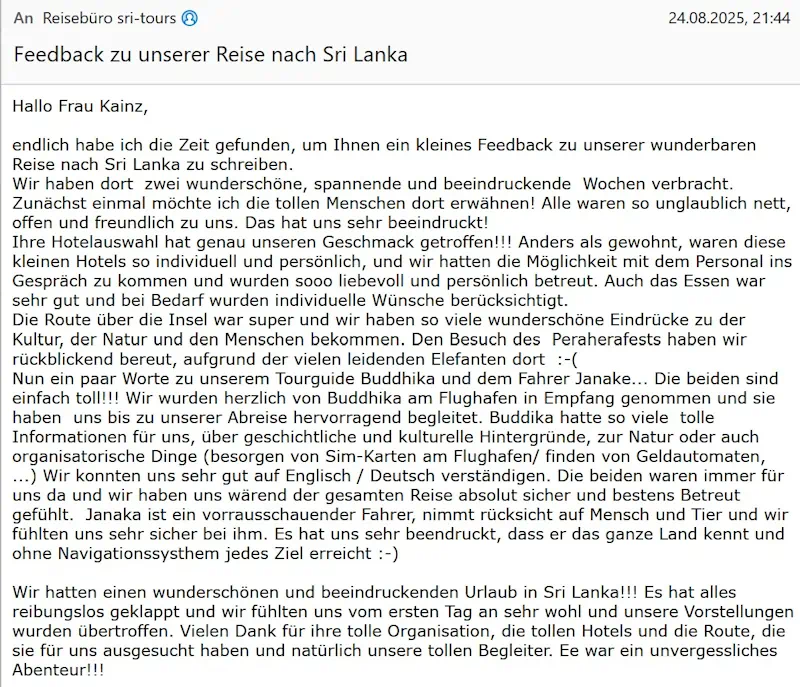 Seit Jahren war es unser Wunsch, Sri Lanka zu besuchen. Endlich konnte er im April 2025 in Erfüllung gehen. Dass wir dazu im Internet auf sri-tours mit Anja Kainz stiessen, war ein riesiges Geschenk. Das grossartige, äusserst abwechslungsreiche Programm war nicht nur perfekt organisiert, sondern Frau Kainz begleitete Vorbereitungen und Durchführung mit einem unglaublichen Engagement und mit einem grossen Wissen. Auch mit den Hotels waren wir mehr als zufrieden. Wir sind einfach dankbar und hoffen, dass noch viele Menschen sich unserer Erfahrung mit sri-tours anschliessen können.